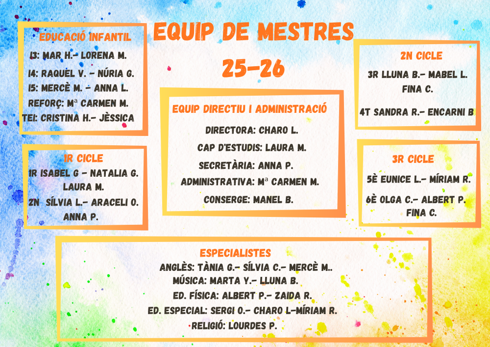 El grup de persones que formem part d’aquesta gran família, apostem per fer una escola propera, activa i moderna. El fet de ser una plantilla estable, ens permet assolir amb èxit els reptes i objectius que ens marquem, any rere any, com escola.