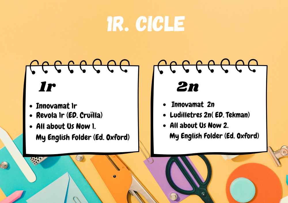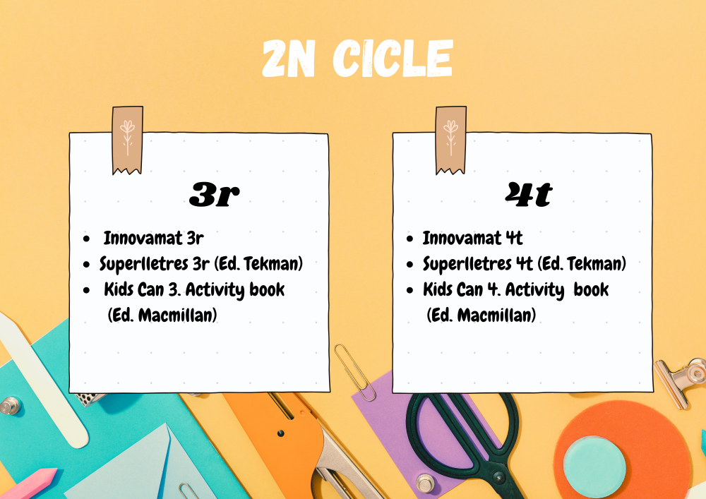Material fungible: Agenda escolar, llibretes diverses, carpetes diverses, retoladors, pintures, plastilina, vernissos, fulls, fulls de colors, fulls de dibuix, gomets, retoladors gruixuts i prims, cartolines, coles, silicona freda, paper d’embalar, paper de xarol, paper seda, paper metal·litzat, aquarel·les, adhesius, fang, cinta adhesiva, fotocòpies, enquadernacions, plastificacions…,